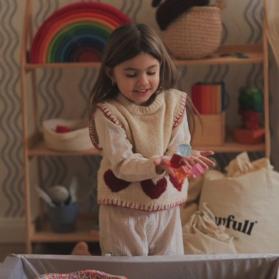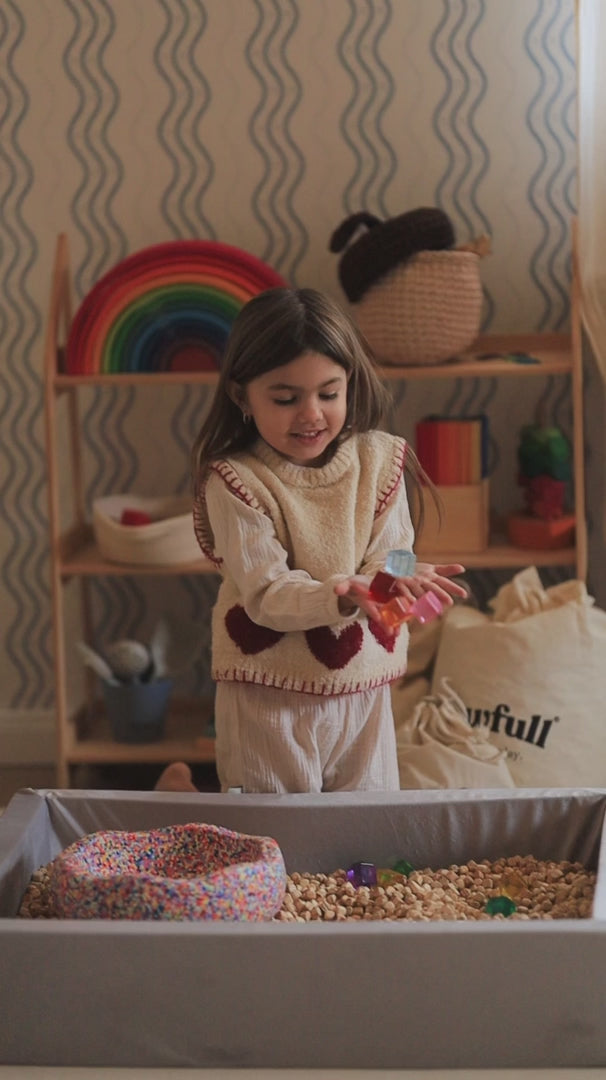 Die Flowfull® Sensorik-Würfelbox schafft einen klar begrenzten, ruhigen Spielraum für sensorisches und kreatives Spiel. Sie wird außen bespielt – ideal auf dem Boden oder auf dem Tisch – und lädt Kinder zum Greifen, Schütten, Sortieren und Gestalten ein.