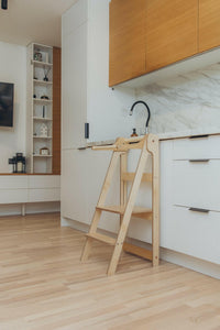 Unser zusammenklappbarer Montessori-Turm (Lernturm) wurde so gestaltet, dass er sich nahtlos in jede Einrichtung einfügt und gleichzeitig äußerst stabil ist. Er ist ein ideales Werkzeug, um die Entwicklung und Selbstständigkeit deines Kindes auf spielerische Weise zu unterstützen.